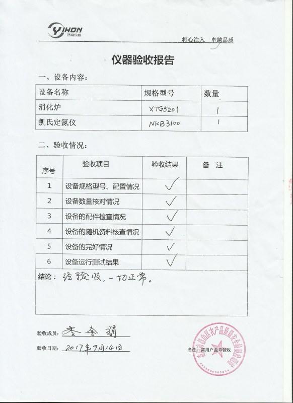 湖南益陽赫山農業局單位主要提供農業技術指導等工作。近期選擇上海祎鴻定氮儀NKB3100,XTG5201消解儀,對土壤等樣品的氮含量檢測,9月底順利驗收合格。